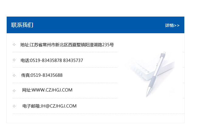 地址:常州市新北區友邦商務大廈1幢16、17層  電話:0519-85101652  傳真:0519-85112595  郵編:213022  網址:www_cz-jiayue_cn.xyxrobot.com  郵箱:xiajifengaa@163.com